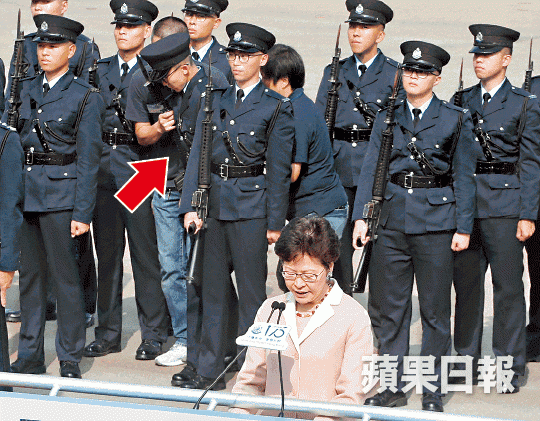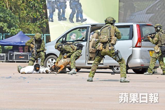 另外,昨日同樂日有多個表演環節,包括以無口令步操砌出1844、175等數字;反恐特勤隊表演徒手拉動重2噸警車;飛虎隊從高樓及直升機游繩而下,與恐怖分子爆發槍戰的反恐演習等。在林鄭月娥致辭期間,她身後操場上一名正在列隊的警員突然不適頭暈,需由工作人員攙扶離場。