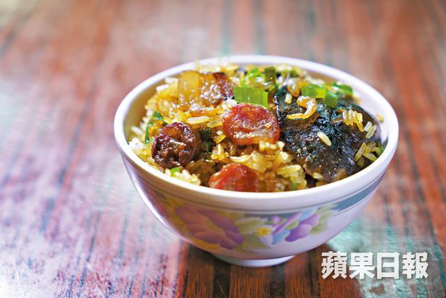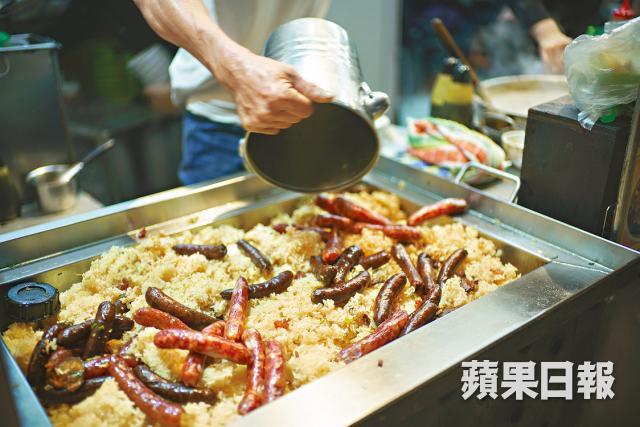 蒸熟的糯米飯,先在熱氣騰騰的車仔上快速打鬆,混入油爆過的臘腸、膶腸、臘肉、蝦米和冬菇,撒上葱花,澆上自家調味豉油翻炒幾下,香氣瞬即飄滿街。