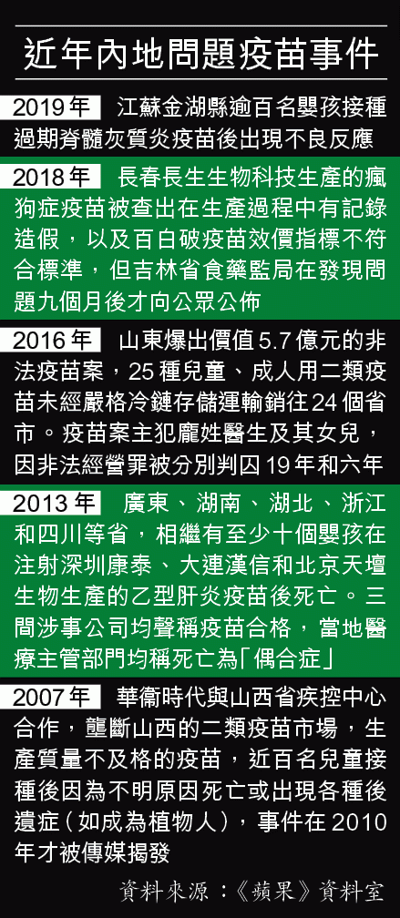 【本報訊】江蘇淮安市金湖縣日前爆出的過期疫苗事件越鬧越大。官方通報近一個月全縣共145名兒童接種了過期脊灰疫苗後,多名家長查詢後發現,子女在過去幾年接種的多種疫苗實為過期,問題最早可追溯到2010年。大批民眾前天圍堵縣政府大樓,當局從周邊地區調來大批武警維穩,前晚試圖驅散示威人群時,據傳有多人被毆受傷。為平息民憤,當局宣佈對副縣長及衞生系統17名負責人分別予以立案調查、開除黨籍和公職等處分。