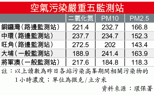截至昨晚8時,中環、旺角及大埔三個監測站均錄得空氣質素健康指數10,其中大埔的PM10懸浮粒子濃度,由早上8時的每立方米54.4微克飆升至晚上6時的每立方米241.4微克。旺角是二氧化氮重災區,由昨午1時起已錄得超過每立方米200微克的濃度,至晚上8時仍高企在每立方米272.5微克;二氧化氮的世衞標準一小時平均值為每立方米200微克。