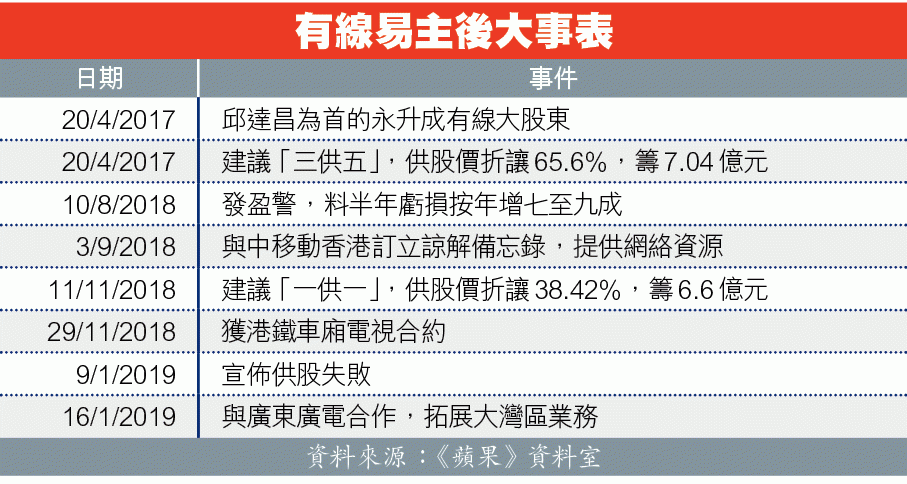 早前有線供股失敗,梁淑儀重申公司已發聲明指,大股東永升全力支持有線,會繼續營運,並加快改革。而早前公司指剩餘900萬元資金用作電視節目發展,有記者質疑資金可以維持多久。梁淑儀指去年與中移動香港及港鐵(066)的合作,對公司收入相當重要。更指這次與廣東廣電合作「係非常重要嘅一步」、「確實係部署大灣區1,400萬人口」。對於營運,她只表示近月收費電視及寬頻上客人數回升,但未能公佈數字。