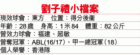 東方龍獅是本地唯一全職籃球隊,這支老牌體育會過去幾季轉行全職後,確實對本地籃壇帶來衝擊,除打破南華與永倫壟斷,還成了首屆ABL冠軍,更值得注意是旗下球員在全職訓練下正不斷提升戰力,劉子禮正是其中之一。這位得分後衞上季在甲一季後賽在東方後上反勝南華過程中,多次在關鍵時刻射入三分球,去年亞運代表港隊對卡塔爾,與超級工商盃為東方對印度分別射入7球及10球三分。