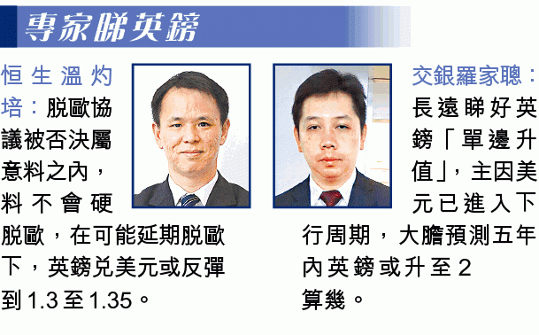【本報訊】英國首相文翠珊提出的脫歐協議草案遭下議院否決,文翠珊領導政府遭遇歷史性慘敗,令英國脫歐前景添憂。英鎊於脫歐協議被否決後下滑,但迅速收復失地,並試闖1.29關。財金專家認為,英國脫歐很大機會採取「拖字訣」解決,料英鎊短線反彈至1.3水平,即英鎊兌港元可望回升至10.2,並睇好英鎊「單邊升值」。