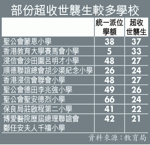 教育局昨公佈統一派位選校名冊,各校自行分配學位和統一派位學額理論上各佔一半,惟在自行分配學位階段,現有學生的弟妹或教職員子女必獲取錄,若此類學生人數太多,便會蠶食統一派位學額。在名校林立的41校網(九龍城、九龍塘),10間學校有8間均有超收「世襲生」,傳統名校拔萃小學、喇沙小學和瑪利諾修院學校(小學部)分別超收4人、6人和4人,令統一派位學額分別僅餘26個、84個和71個。