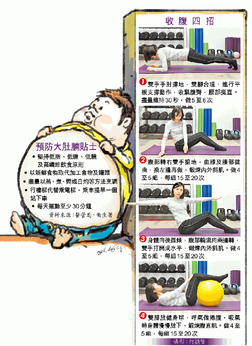 【本報訊】大時大節食不停,肚腩現形令人尷尬。體適能教練表示,腹部囤積的內臟脂肪,比皮下脂肪對健康更具威脅須提防,強調減肚腩無捷徑,要從整體燒脂做起,推介四招收腹運動有助強化肌肉,配合帶氧運動及飲食調控,多管齊下踢走大肚腩。