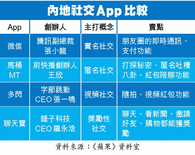 「馬桶MT」主打匿名社交,即用戶可以匿名聊天、帶起話題、收發紅包等。「多閃」是字節跳動的第一款社交App,主打視頻社交,用戶可隨意拍攝視頻分享,但沒有公開按讚或留言功能。「聊天寶」前身是去年發行一周後,即位居內地App Store榜首的「子彈短信」,主打獎勵聊天,用戶可以從聊天、購物、遊戲或完成任務賺取金幣,而金幣可按比例轉換為現金。