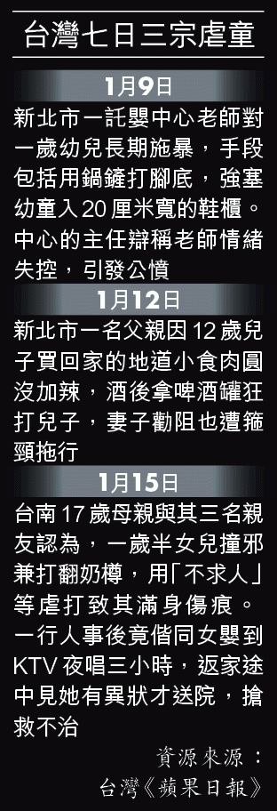 台灣繼男童買肉圓沒加辣遭父痛毆後,前晚又發生虐童致死案!嬰兒愛哭鬧、打翻東西本是平常事,但17歲媽媽竟因此用「不求人」將一歲半大的女兒毒打一頓。狠母事後更與三親友抱嬰出街唱K三小時才求醫,女嬰最終返天乏術。警方調查發現,四人平日認為女嬰「撞邪」,「看到她哭就打」。法醫指女嬰全身滿佈瘀青,顱內出血,疑是抓頭撞牆或地面所致,其慘況連辦案的檢察官亦當場哽咽:「會窮盡一切偵查手段」。