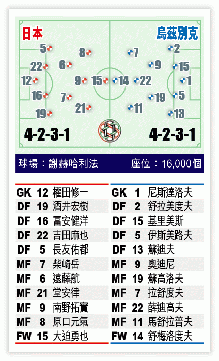 對手烏茲別克在首仗險勝阿曼後,次役鬥土庫曼展現出強大攻擊力,單是上半場已經轟入四球,最終以4:0大勝對手。其中取代巴美夫出任正選箭頭的小將舒梅洛度夫表現出色,梅開二度下領球隊大勝一場,加上中場發電機隊長奧迪尼助陣,其大局觀在亞洲層面亦屬一流水平。從對土庫曼一戰可看出,烏茲別克極具默契,而且反擊速度高,相信將令日本防線極為頭痛。