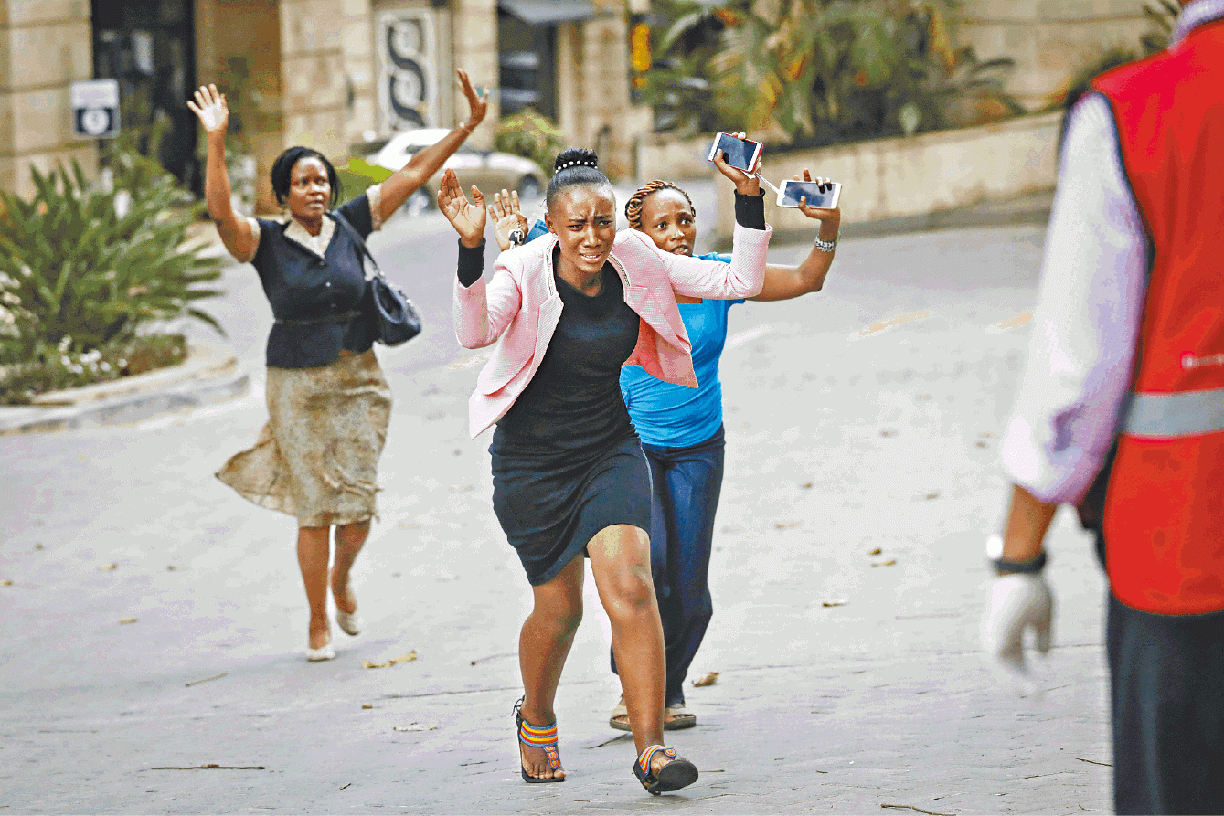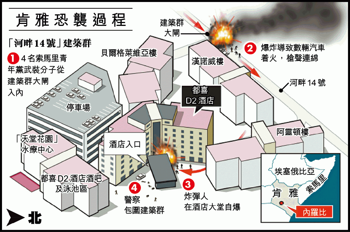 東非國家肯雅首都內羅比一個外國人聚集的高級酒店區,前日遭遇恐怖襲擊,至少14人死,包括英國及美國公民各一,總統肯雅塔(Uhuru Kenyatta)在首次爆炸發生近20小時後才宣佈事件告一段落,伊斯蘭極端組織阿蓋德分支索馬里「青年黨」(Al-Shabaab)承認施襲。