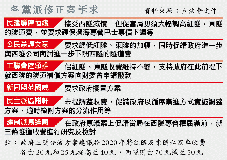 政府的三隧分流方案建議在2020年將紅隧和東隧私家車收費,分別由20元和25元提高至40元,西隧則由70元減至50元,多個黨派一直以紅隧、東隧加幅過高為由反對。民建聯陳恒鑌的修正案指明接受西隧減價,促請當局毋須大幅調高紅隧、東隧的隧道費;公民黨譚文豪提出的修正案同樣要求調低紅隧、東隧的加幅,並要求政府進一步與西隧公司商討進一步下調西隧的隧道費。