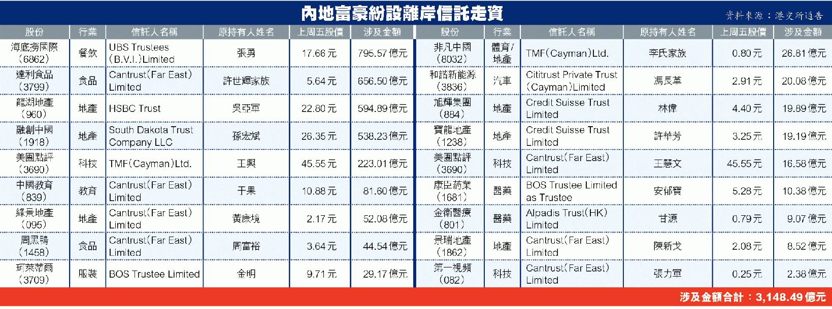 【財經專題】近年中國富豪身家大增,根據彭博報道,融創(1918)孫宏斌等四名富豪,紛紛於境外成立信託,以代為持有上市公司股權,「走資」金額達172億美元。此風越吹越烈,本報調查發現,單是去年有18位內地來香港上市的公司股東或創辦人,將個人或家族持股轉移至離岸信託,金額達3,148億元。