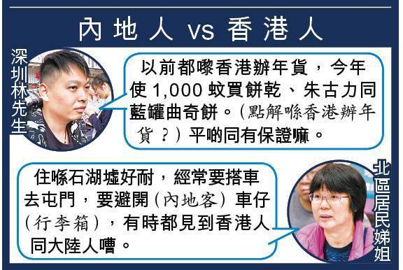 人滿為患,居民叫苦連天。居於彩園邨的邦媽慨嘆內地人擠滿上水,阻礙居民生活和出入,「呢度好多老人家,四圍大陸人落嚟買嘢,火車站又逼滿人」,且日用品不時缺貨,「買日用品都缺,𠵱家唔敢用完先買,貴都唔係問題,係驚冇得買」。從深圳來港辦年貨的汪女士表示,春節將回老家湖南與家人過年,故特意來買金莎朱古力、龍眼果乾等小孩愛吃的食品過節,「多數在港購買,絕少在內地,因為(貨品)香港比較齊」,今次消費約一千元。