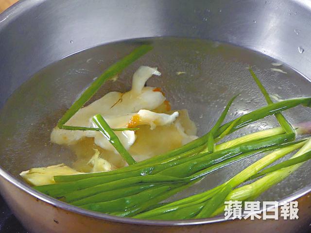 1. 花膠用凍水浸約兩小時至軟身,煲一鑊水,加薑葱, 滾起後放入花膠,再滾,熄火,蓋焗3小時,洗淨可用。