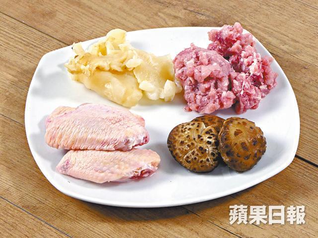 2. 將1隻冬菇和1塊已浸花膠切粒,拌入免治豬肉,加鹽1/4茶匙、生粉2茶匙、糖1/4茶匙和豉油1茶匙,拌勻,撻五至六下成結實餡料。其餘花膠切件。
