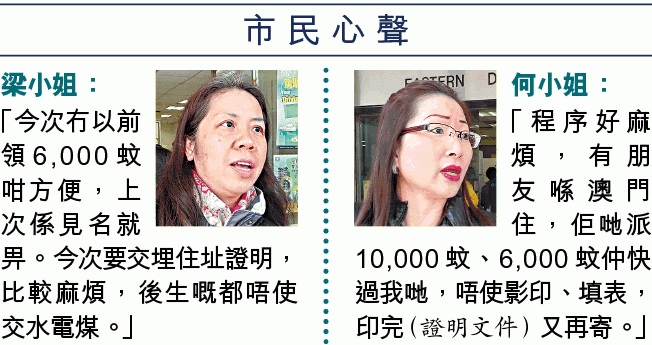 任職室內設計師何小姐特別在中午時分抽空前來領取表格,她曾詢問職員如何填表和注意事項,但職員未能解答疑問,僅給予計劃的熱線電話,「佢(職員)話完全未睇過,所以唔知……淨係叫我打電話」。她又多次投訴申請程序好麻煩,又提到澳門政府派錢效率高於香港,「我有朋友澳門住,一萬蚊、6,000蚊仲快過我哋攞咗,唔使話影印、填表,印完再寄」。她指等足九個月才能開始申領4,000元,但最後卻要完成如此複雜程序,「我情願唔要」。