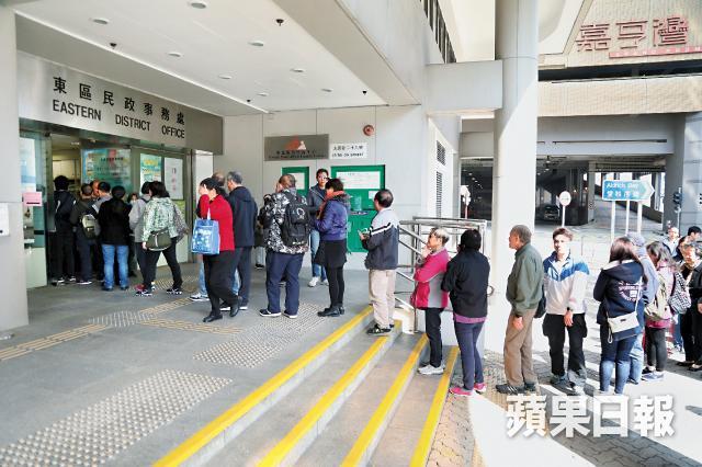「關愛共享計劃」昨日派出58萬份申請表格,《蘋果》昨午到東區民政事務處諮詢中心,現場約有20人等候。職員表示每人限取兩份,若需領取多於兩份,則需再次排隊。