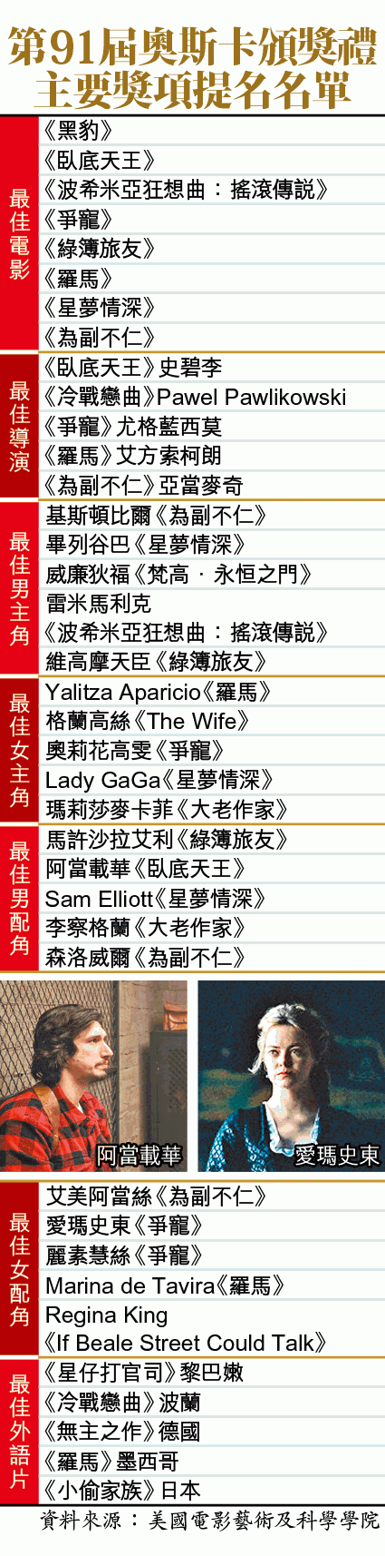 第91屆奧斯卡頒獎禮大會昨晚公佈各組別入圍名單,《爭寵》和黑白電影《羅馬》獲最多10項提名,不過最矚目還是最佳女主角之爭,Lady GaGa再叫糊做影后,但對手中卻有宿敵格蘭高絲,而今年更首次有Marvel電影《黑豹》候選最佳電影。
