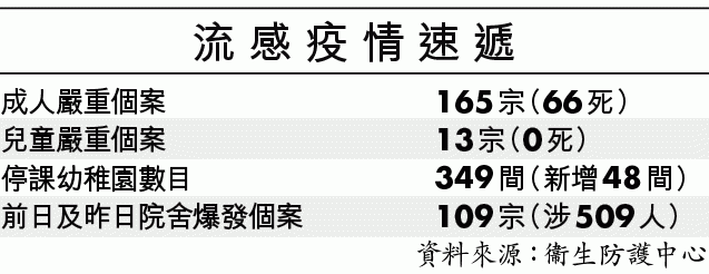 【本報訊】冬季流感高峯持續。衞生防護中心數字顯示,公立醫院急症室每千名求診者中,有254.7人有流感病徵,比率高達四分之一,是去年3月以來最高。此外,今個高峯期已有66人死於流感,包括前日新增的兩名成人,幸暫未有兒童死於流感。昨日亦再多48間幼稚園或幼兒中心停課,令全港停課學校累計增至349間。