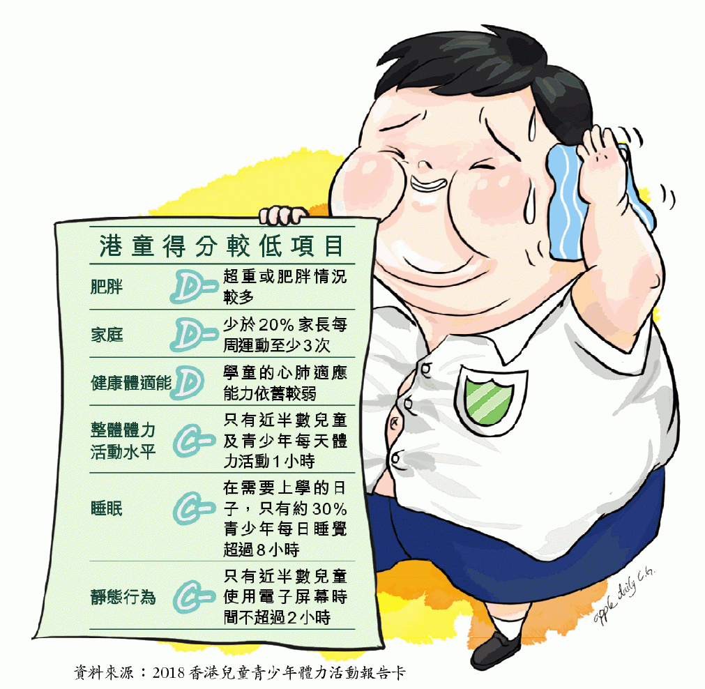 至於健康體適能評分則只有D。報告指,香港學校對學童的體適能有良好監測,但他們的心肺適應能力依舊較弱,在10個亞洲國家的學童中,港童的心肺耐力指標排尾三。