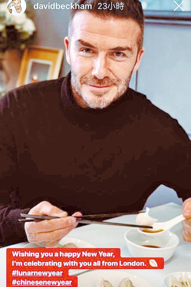 另一方面,英國萬人迷碧咸(David Beckham)夫婦也在社交網拜年,碧咸公開自己吃點心的相片,寫道:「祝你新年快樂,我正在倫敦與你一起慶祝。」又特別於hashtag中提到農曆新年。碧咸嫂Victoria則拍片表示:「農曆新年快樂,我想祝大家新年快樂,有滿滿的愛、開心與喜樂,常常充滿笑容。」藉此希望平息大仔Brooklyn去年鬧出的辱華風波。