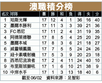 曾在英超及英冠打滾多年的前鋒方祖個人已累積12球,上仗對墨城埋齋也終止四場入球荒;陣容上,雖然球隊仍有施安迪莊及布夏基亞等傷兵,幸米高蘇路停賽復出,中前場兵源充裕,而且悉尼今季主客戰力沒明顯分野,11場勝利中,主場佔六場,作客佔五場,今仗不難再添三分。