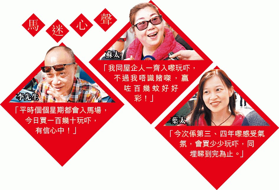 張先生與一眾好友入場,他指自己平常都有投注賽馬,投注二、三百元,稱已鑽研一個晚上,有八成信心贏馬。朋友陳太則指不常賭博,但會破例投注100元。來自廣東的遊客李氏姊妹入場「感受香港氣氛,湊個熱鬧」。