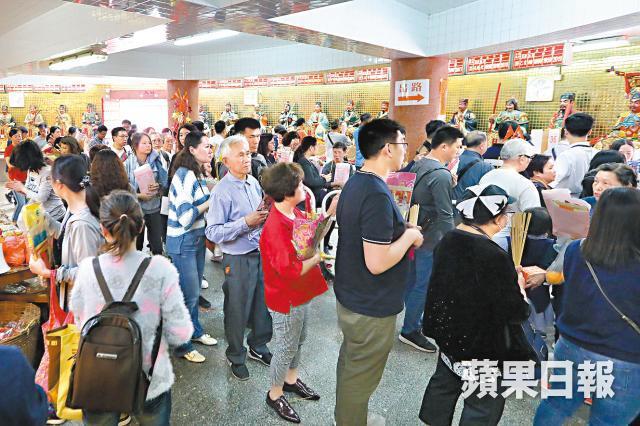 記者昨現場所見,逾300名善信於同一時間輪候進入拜太歲的元辰殿,多名職員在場維持秩序,由保安員分批帶善信到殿中央參拜太歲統領「斗姥(姆)元君」,再指示人群在殿內排隊,輪候參拜今年太歲36號「謝太」大將軍,再按出生年份拜見所屬「大將軍」。今年續禁止市民在殿內燒香,由職員代為收集後一併化寶。