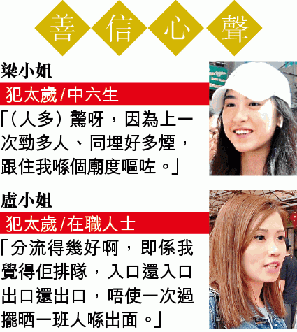 圓玄學院內有售一份40元的太歲衣包連長壽香及細香,職員指僅太歲衣較去年加價五元。家庭主婦許小姐認為加幅稍多,「應該加一兩蚊,但嚟到呢度要拜,就冇得話合唔合理」。圓玄學院回應指,自前年實施人流和車流管制,「感覺善信越來越習慣安排」,未來會繼續改善通風系統。