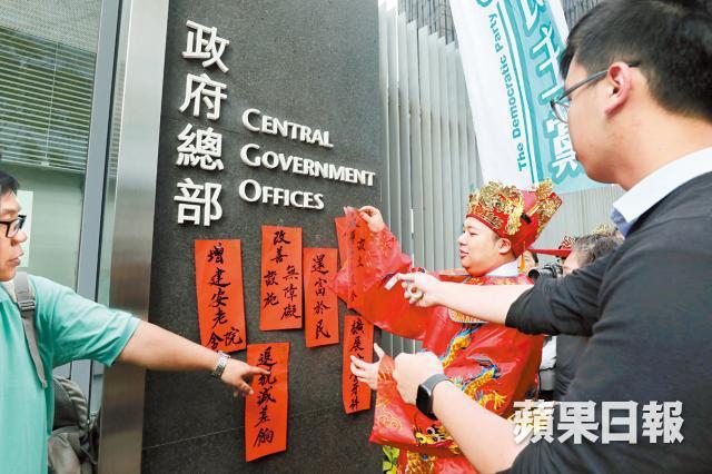 【本報訊】多個民主派政黨昨日趁年初三「赤口」,分別遊行到禮賓府和政府總部抗議。其中社民連和人民力量近30名成員,抗議特首林鄭月娥在農曆新年前落實扣減長者綜援,寧將萬億公帑「倒落海」興建人工島大白象,也不理基層死活,狠批「長者無飯開,人工島充飢?」要求林鄭下台。
