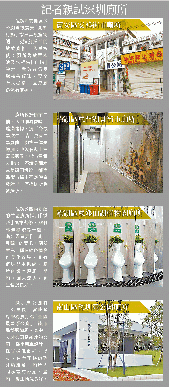 中國一線城市深圳的「廁所改革」進程又如何?《蘋果》記者直擊深圳福田區、南山區、寶安區多座公廁。仙湖植物園內竹區、天上人間廁所裝潢精美,有蹲廁也有坐廁,尿兜上更種綠色植物,稱有系統祛味,廁所內有清潔工人駐場,定時清潔,記者在這兩所廁所的確沒有看到髒亂情況,也許與公園人流較少有關。不少內地媒體常用這兩座廁所來作「廁所革命」藍本,以彰顯「廁所革命成功」。有受訪市民指,「天上人間」廁所的整潔程度有120分。