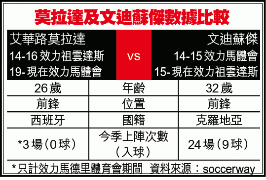 今場賽事的其中一個有趣之處,就是雙方的前鋒艾華路莫拉達(圖)和文迪蘇傑互相倒戈,兩人先後離開馬德里體育會和祖雲達斯,結果命途各異,一個越踢越有,而另一人就已經成為球隊棄將。