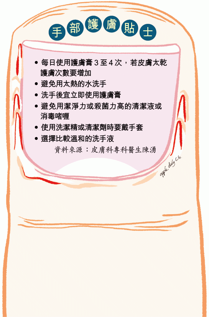 手指有倒刺切忌亂搣,否則隨時令皮膚撕開更大傷口,增細菌感染風險。陳指,使用酒精為皮膚殺菌也是錯誤做法,正確為即時用乾淨的指甲鉗,剪走倒刺便可。想減少倒刺形成及預防皮膚乾燥,護膚程序不可缺少,「好多人用潤手膏時,多數用喺手心,忽略咗手背嘅皮膚,其實手指附近嘅皮膚都要保護」。他建議每日使用潤膚膏三至四次,尤其洗手後,如皮膚特別乾燥,使用次數要更多。