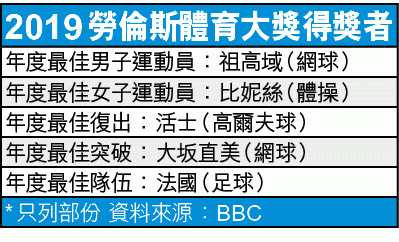 【綜合摩納哥外電】一年一度的勞倫斯體育大獎周一在摩納哥舉行頒獎典禮,今年的得獎者不少都是當今的體壇巨星,奪15個大滿貫冠軍的網球一哥祖高域,獲頒年度最佳男子運動員,而美國體操小天后比妮絲,則獲得年度最佳女子運動員。其餘得獎名單,包括美國高爾夫球名將活士、日本網球手大坂直美以及前阿仙奴領隊雲格均榜上有名。
