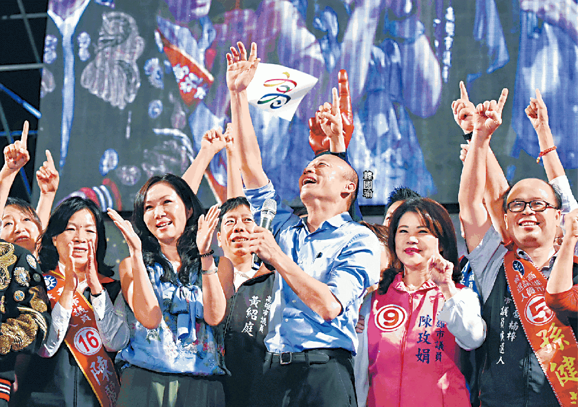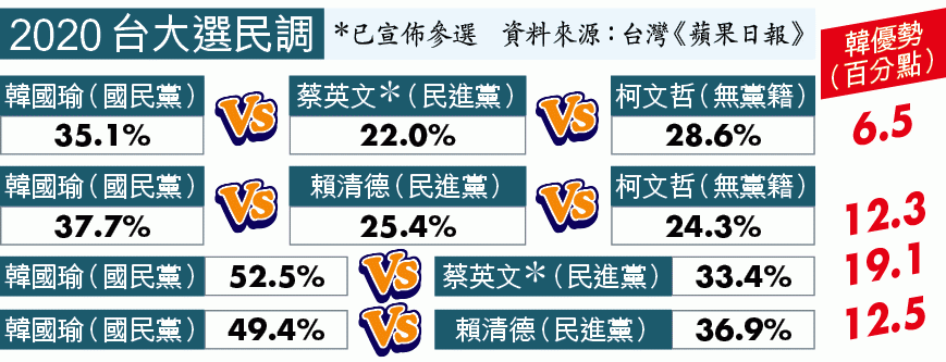 台灣大選將在明年1月舉行,台灣《蘋果》委託世新大學進行的民調顯示,若韓國瑜代表國民黨角逐,其目前的支持度足以擊敗任何其他潛在候選人。若大選由韓國瑜、無黨籍的柯文哲和蔡英文三人角逐,支持度35.1%的韓可望力壓28.6%的柯當選,反觀蔡的支持度僅22%。