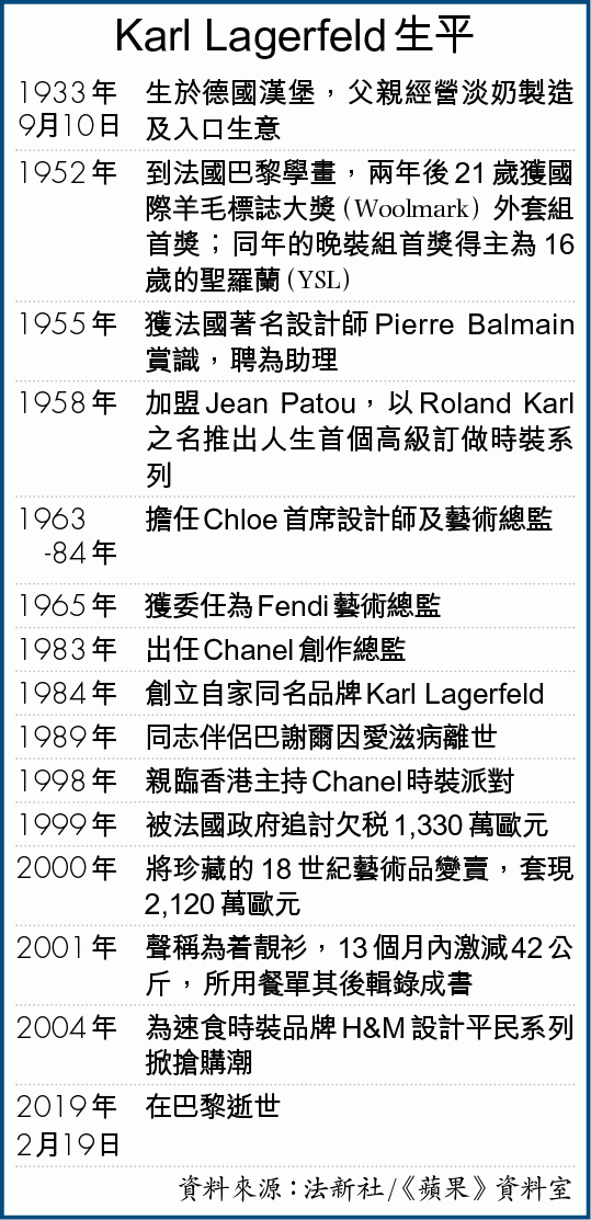 「我設計就如呼吸。呼吸不用刻意,一切來得自然。」高級時裝品牌Chanel及Fendi創作總監「老佛爺」Karl Lagerfeld,昨日早上在法國巴黎一間醫院逝世,終年85歲,結束這一代時裝巨人在業界呼風喚雨逾半世紀的傳奇。