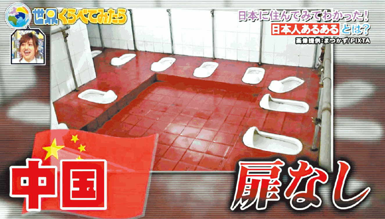 節目中一名受訪中國女子臉有難色,指中國很多廁所連門都沒有。節目又亮出中國廁所照片,可見一室之內有多個蹲廁,沒有門分隔,使用者要一起蹲在房內,與身邊素不相識者同蹲一廁。女子繼續介紹中國更古舊的廁所,指以前中國廁所只有一條坑,人有三急時,大家前後排排如廁,蹲後者要對着前面如廁者屁股和排泄物,氣味可想而知令人多難受。受訪女子還說,她小時曾不小心失足跌下「冀坑」,日本搞笑女藝人渡邊直美聽罷不禁呼叫。