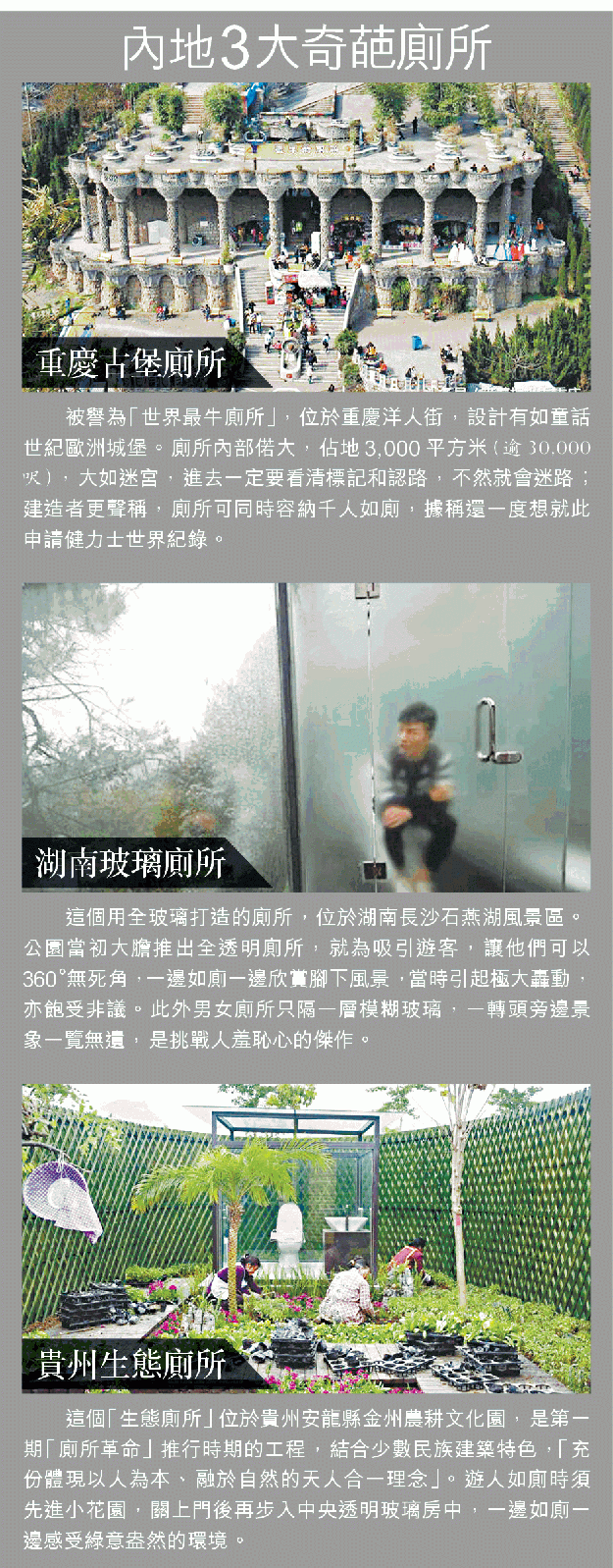 中國廁所衞生情況欠佳,不但影響公共衞生有損市容,還曾醜出國際。東北延邊的旱廁的開放程度就曾嚇怕外國人,更被日本清談節目討論,指面對中國廁所,除了中國人可以冷靜對待,全球62億人都會感到震驚!