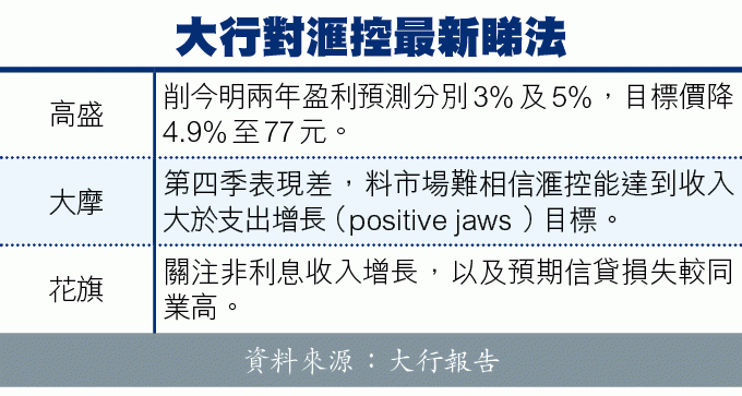 大摩用「全方位不達標」(All-round Miss)為題發表季績簡報,指滙控收益低、支出高、撥備升、資本率偏低,皆遜於證券界預測,收入支出率亦未達全年正增長承諾,管理層雖強調今年開局強勁,惟市場對達標難有信心。高盛維持「購入」評級,但調低滙控目標價4.94%至77港元。