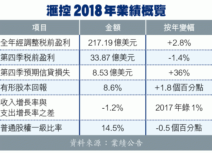 【本報訊】滙控昨公佈全年業績,數據未令市場滿意,股價即插。受英國脫歐、中美貿易戰及加息逆轉等風險困擾,去年第4季滙控收益明顯轉差,預期信貸損失(ECL)飆升,季內經調整稅前盈利按年跌1.37%至33.87億美元,全年計雖力保3%增幅,但大摩直指業績全方位「走樣」,高盛亦調低目標價。