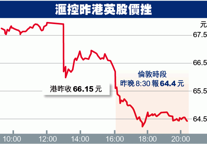 大笨象昨中午派成績,午後開市8分鐘,股價即跌2.7%至全日低位65.85港元,收市報66.15港元,跌2.29%;倫敦開市後淡友接力沽貨,傍晚折合港元計插穿65元關口,在64.4港元徘徊,較本港收市價再跌2.6%。