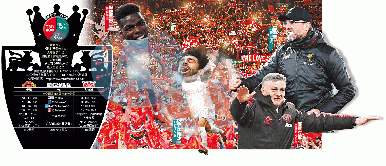 雖然有人喜歡藍,但無可否認,周日英超大戰碰頭的「雙紅」紅魔鬼曼聯與紅軍利物浦,才是英國足球最成功兼最受歡迎的兩家球會。雙紅球會相距僅35英里(約56公里),卻從來都不是好鄰居,曼徹斯特與利物浦這兩個城巿在19世紀因曼徹斯特運河而結樑子,之後一直鬥生鬥死,而足球更令他們的鬥爭白熱化。