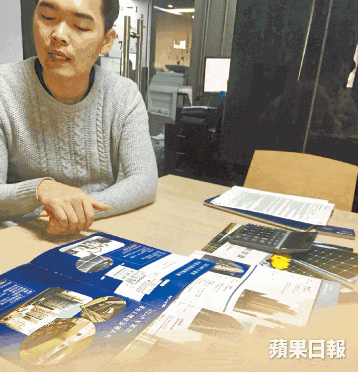 之後他向記者分析每年的盈利,投資30萬元、以平均每日五小時日照計算,料每年能產生18,250度電,能賺取91,250元,以投資者六成利潤計,每年收入54,750元,回報率達18%,五年多就能回本。他亦指以30萬元投資額計算,承諾首半年每月利潤最少有5,000元。