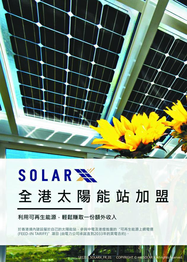 【本報訊】中電(002)去年落實上網電價政策,以每度電3至5元向民間回購可再生能源電力,由於回報「和味」,除了吸引不少村屋在天台安裝太陽能板,更淪為集團牟利工具。《蘋果》發現,一間名為SOLAR X的公司以「太陽能加盟計劃」為名,在網上大賣廣告,以每年回報18%吸引人投資屋苑天台太陽能發電項目,更聲稱首個合作屋苑為將軍澳茵怡花園,「確保首6個月利潤、15年回報達274%,現時已集資過千萬」;給投資者簽的意向書更寫到資金或投資境外地區。