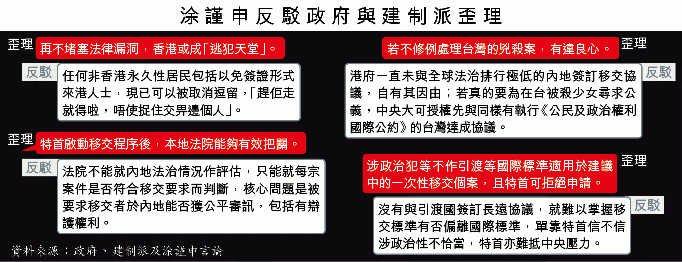 港府以少女潘曉穎去年在台灣疑被謀殺案提出修例,強調要填補法律漏洞,關注引渡協議多年的涂謹申接受《蘋果》訪問時反駁《逃犯條例》不關乎漏洞,主要是涉制度差異引伸的困難,指兩地在重大原則及價值觀上未能磨合,否則不會磋商多年不果,「個死結就係唔能夠話我(香港)解開佢,我畀你(內地)就得」,指摘港府做法極為兒戲及不負責任。