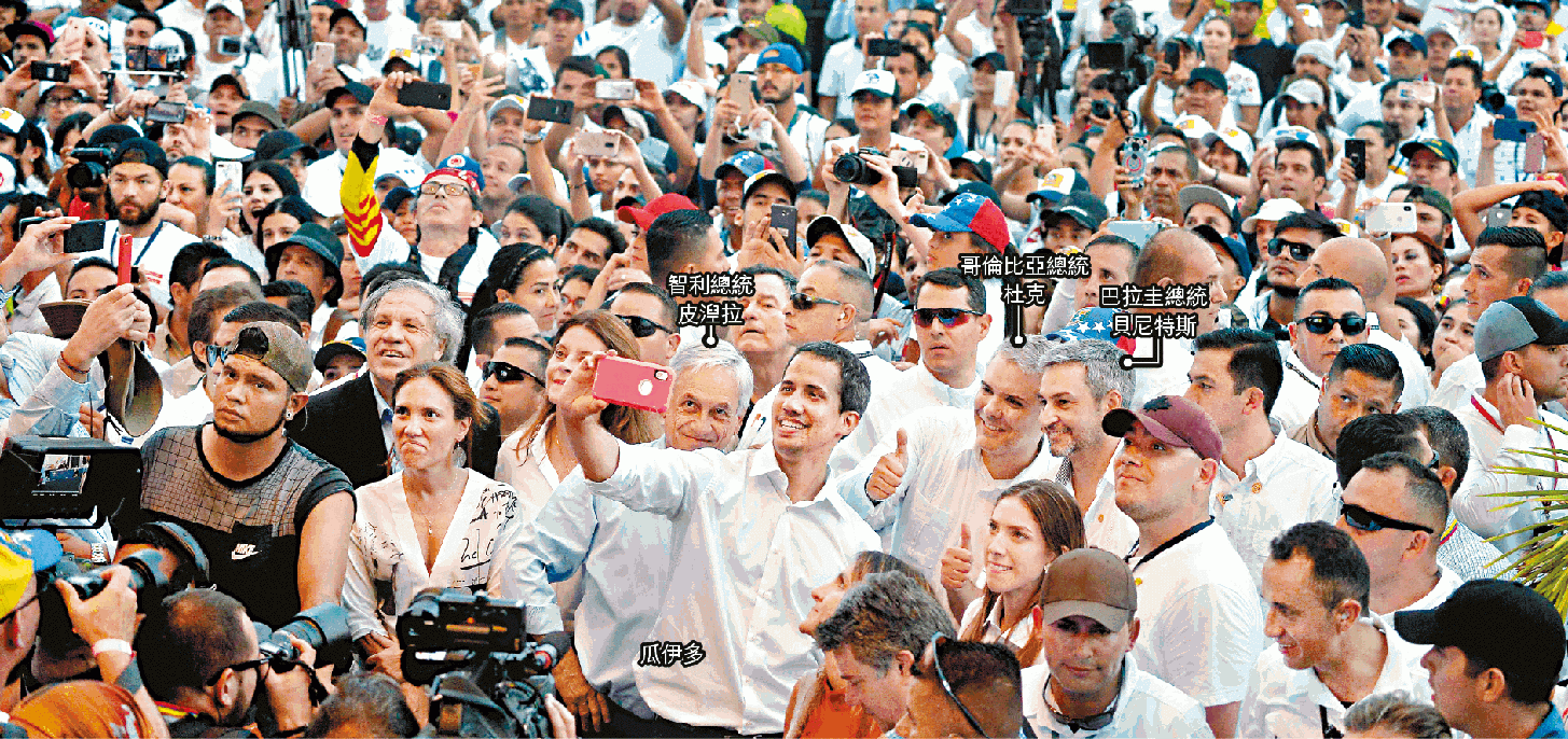 瓜伊多前天在庫庫塔舉行的「委內瑞拉援助音樂會」驚喜現身,跟哥國、智利和巴拉圭總統擁抱,並以搖滾巨星姿態上台接受32萬觀眾歡呼。他之後到當地貯存滯留援助醫藥和糧食的倉庫,呼籲委國民眾協助運物資闖關入國:「委內瑞拉人民不是在乞求,他們是抵抗獨裁。」
