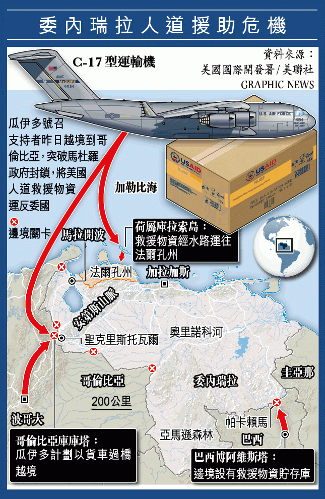 【雙胞總統】委內瑞拉「總統鬧雙胞」僵局持續一個月後,自封臨時總統的反對派領袖瓜伊多,昨天藉運送人道物資,向總統馬杜羅攤牌。他前天突破出境禁令,現身鄰國哥倫比亞邊境的籌款音樂會,稱得到軍方協助,並號召民眾分三路助運送人道物資入境。馬杜羅則下令將三條通道全面封殺,這次攤牌將測試軍方對馬杜羅的忠誠度。