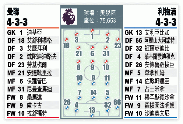 而蘇B上周領軍作客車仔,就改以穩守突擊應付,全場僅得約三成控球率下,反而靠兩個效率甚高的中場安達靴里拉及保羅普巴突擊得手,靠側擊撕破車仔防線後入楔頭槌頂入贏2:0。紅魔今仗面對以反擊速度聞名的紅軍,預計不會再推前防線逼搶,甚至願意讓出控球。賽前有消息指馬迪爾及連格有望趕及傷癒,惟預計馬上復任正選機會皆不大。