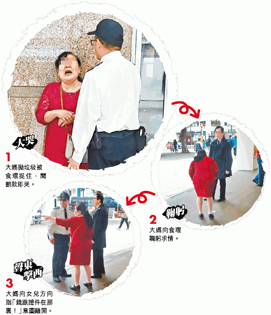 拋垃圾斷正要點做?一哭二鬧三着草?有巿民目擊一名內地大媽被食環署當場舉證亂拋垃圾,一邊求情哭喊又鞠躬,一邊聲稱無錢無證件,哀求食環職員放行及企圖逃走,最終被職員力阻,公事公辦。