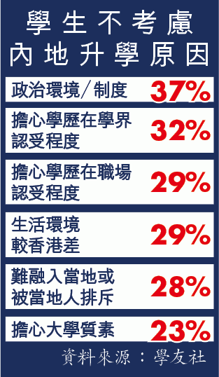 學友社去年12月至今年1月以問卷訪問1,970名應屆文憑試考生,20%人會考慮到內地升學,當中61%人認為因內地大學收生要求較低、32%人認為學費較便宜。表示不考慮的學生中,37%人表示與政治環境或制度有關,另32%人擔心內地大學學歷在學界的認受程度、29%人擔心學歷在職場的認受程度。