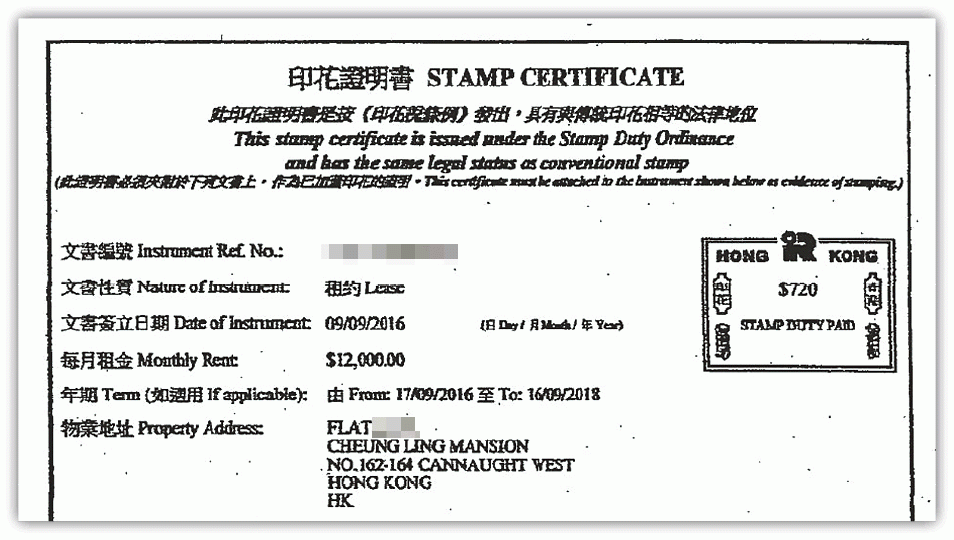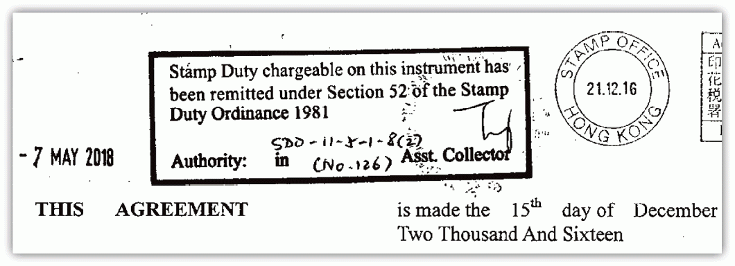 根據物業的正式買賣合約,新民置業購入單位時,首頁中「印花稅」一欄為「Pending Adjudication(有待裁決)」,即暫緩繳交印花稅,內頁亦未有印花證明書。直至2018年5月尾,新民置業再登記一份「再次登記買賣合約(Re-registration For Sale And Purchase)」。這份合約內頁多了一個印鑑,表明根據《印花稅條例》第52條獲減免印花稅 (Stamp Duty chargeable on this instrument has been remitted under Section 52 of the Stamp Duty Ordinance 1981)。該稅局印鑑日期為2018年5月7日,亦即待租客離開後,新民置業獲得印花稅豁免。